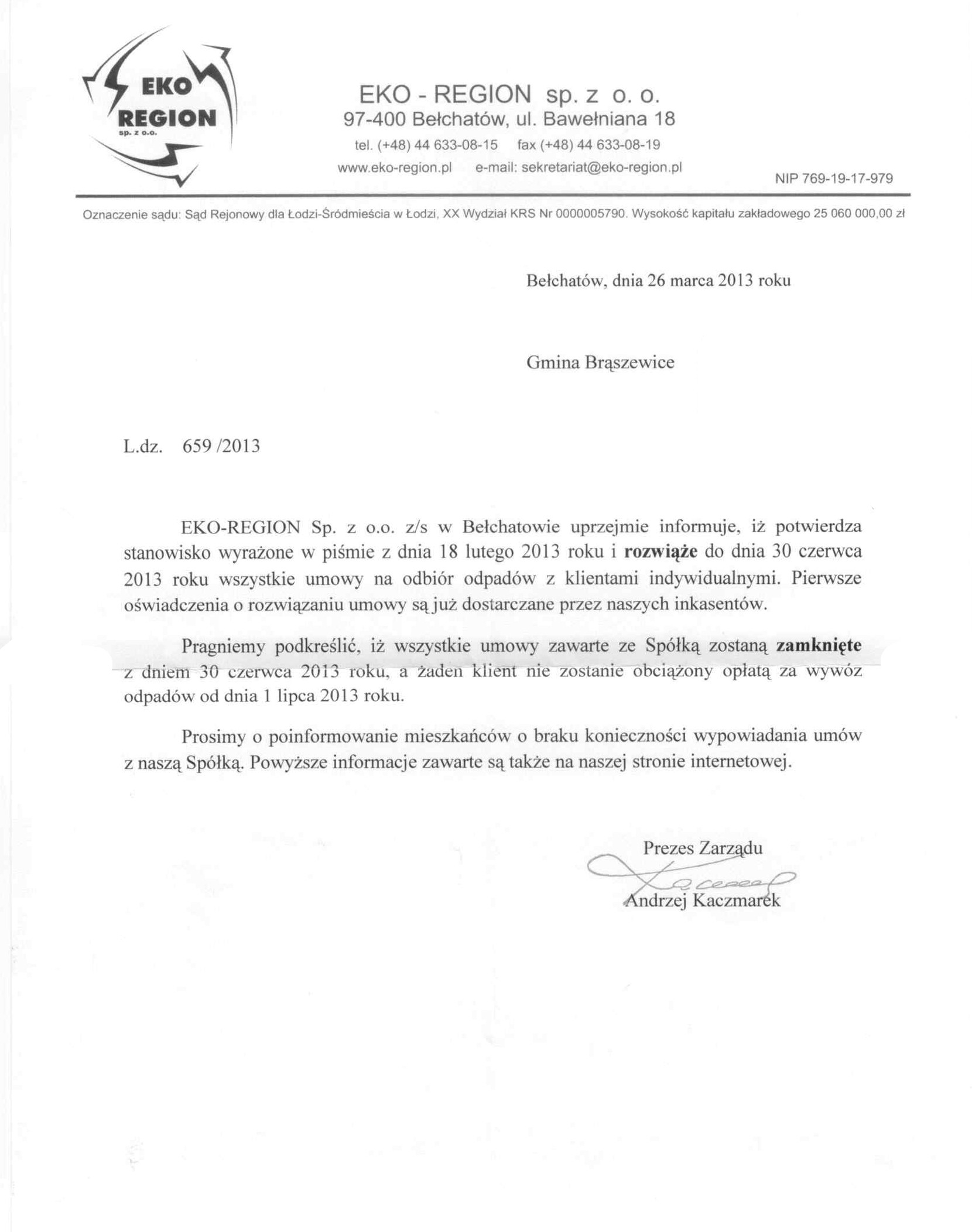 W związku z tym nie ma konieczności indywidualnego wypowiadania umów. Powyższe informacje zawarte są także na stronie http://www.eko-region.pl/.