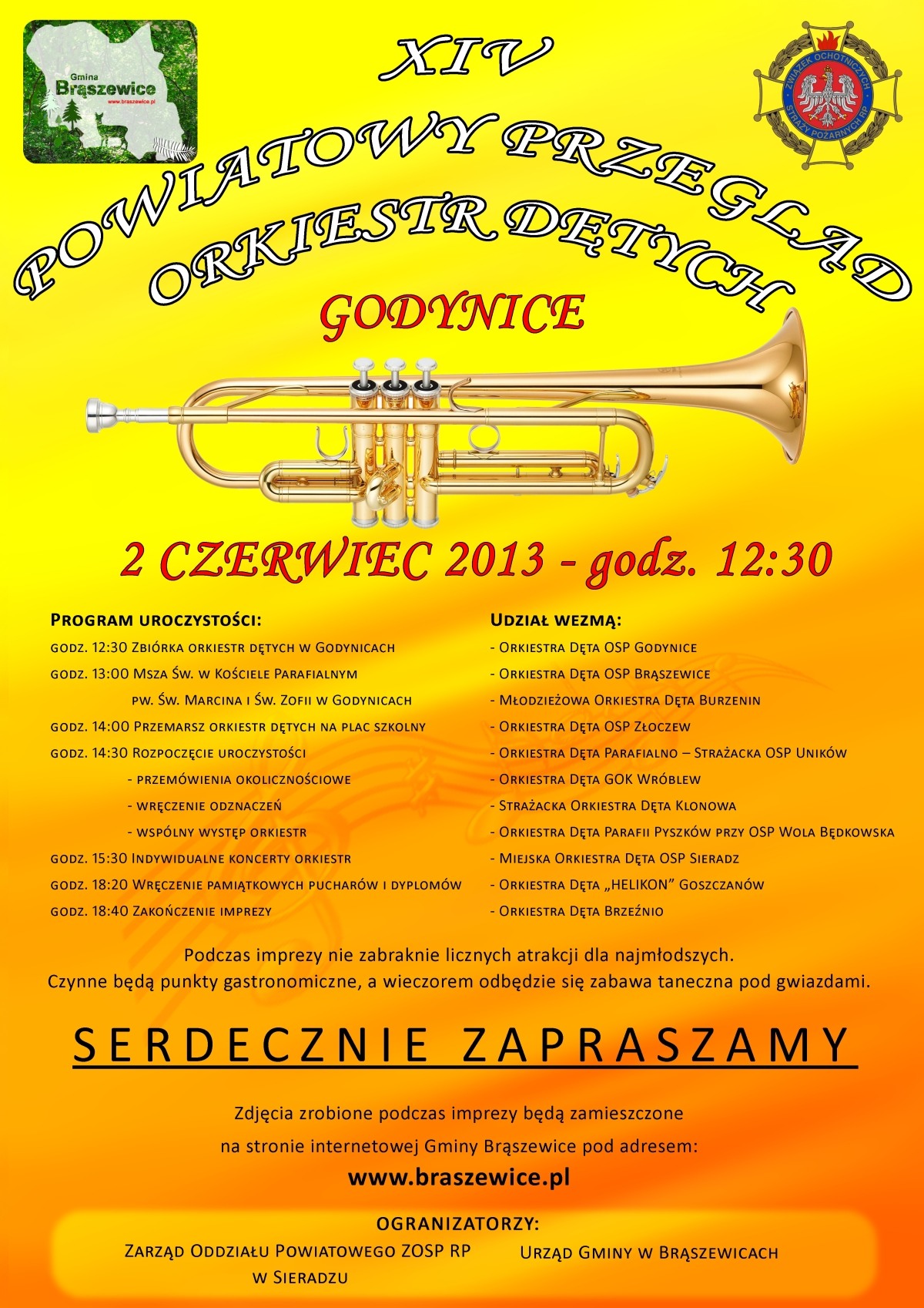 Zarząd Oddziału Powiatowego ZOSP RP w Sieradzu i Urząd Gminy w Brąszewicach serdecznie zapraszają na XIV Powiatowy Przegląd Orkiestr Dętych.